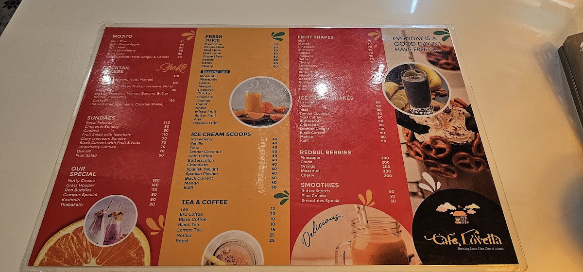 Welcome to Cafe Lovella, a hidden gem located at the heart of Pala, Kerala. This vibrant café offers an extensive menu that caters to all tastes, from succulent Fried Chicken Meals to vegetarian options like the Veg. Burger and Veg. Wrap. Among the highlights are the crispy Thai Sweet Chilli Wings and the indulgent Chicken Smash Burger, each bursting with flavor.